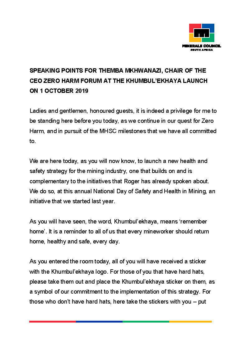 The Minerals Council South Africa today formally launched the Khumbul’ekhaya initiative, a CEO-led strategy on health and safety, developed and led by the Minerals Council CEO Zero Harm Forum. The aim of the initiative is to drive and sustain the mining industry’s pursuit of Zero Harm, with a particular emphasis on eliminating fatalities.